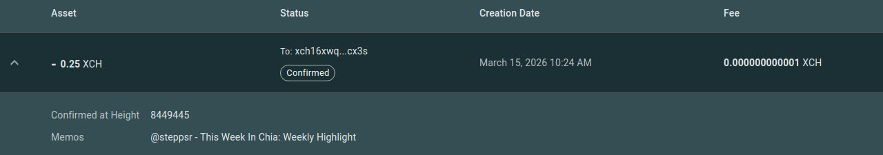 Weekly Highlight: Spacescan! A well deserving core community member providing a valuable service to everyone with a blockchain explorer, charts, CAT & NFT explorer, tools, API, and recently Offer files. Join me in showing some love if you want: xch1a6cd558gqsz2hch5pt0l8mx7zhavf32q5lyde09zjtqcmkelr9ns59k0j8 or see their Support page. ๐