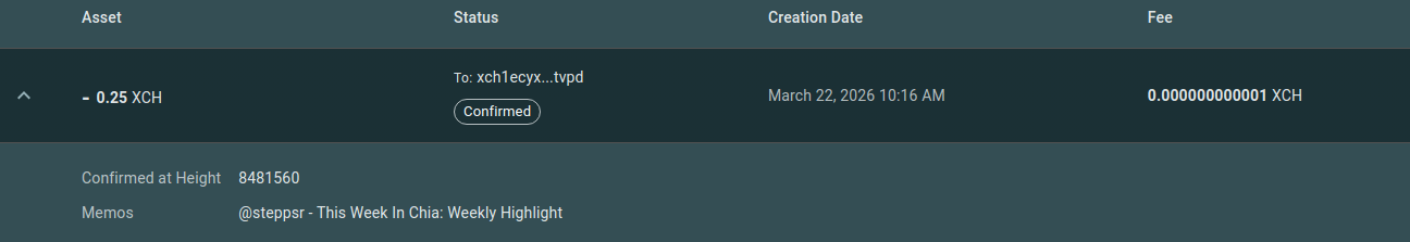 Weekly Highlight: Spacescan โ the go-to Chia blockchain explorer! Dive into real-time XCH data, detailed charts, CAT & NFT explorers, powerful tools, API access, Offer file support, and more. A true pillar of the communityโshow some appreciation: xch1a6cd558gqsz2hch5pt0l8mx7zhavf32q5lyde09zjtqcmkelr9ns59k0j8 or visit their Support page. ๐๐ฑ